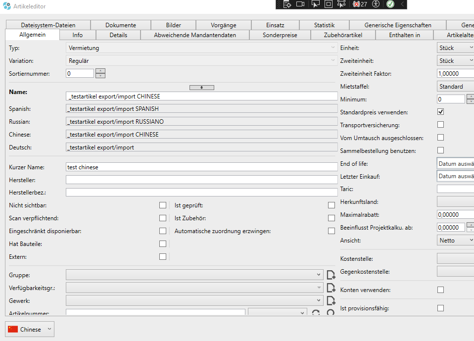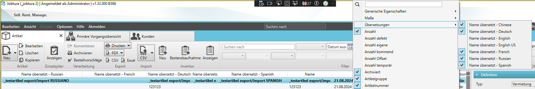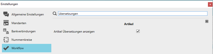 Neue Artikel-Tabellenspalten: “Übersetzungen” -> “Name – Übersetzung”, sowie die Workflow-Einstellung “Artikel Übersetzungen anzeigen”, um diese im Artikeleditor anzeigen zu lassen. Beim Import von Artikeln mit Übersetzungen, werden Übersetzungen mit importiert und vorhandene Übersetzungen aktualisiert. Bei der Standardsprache hat die Übersetzung Vorrang – wenn vorhanden.